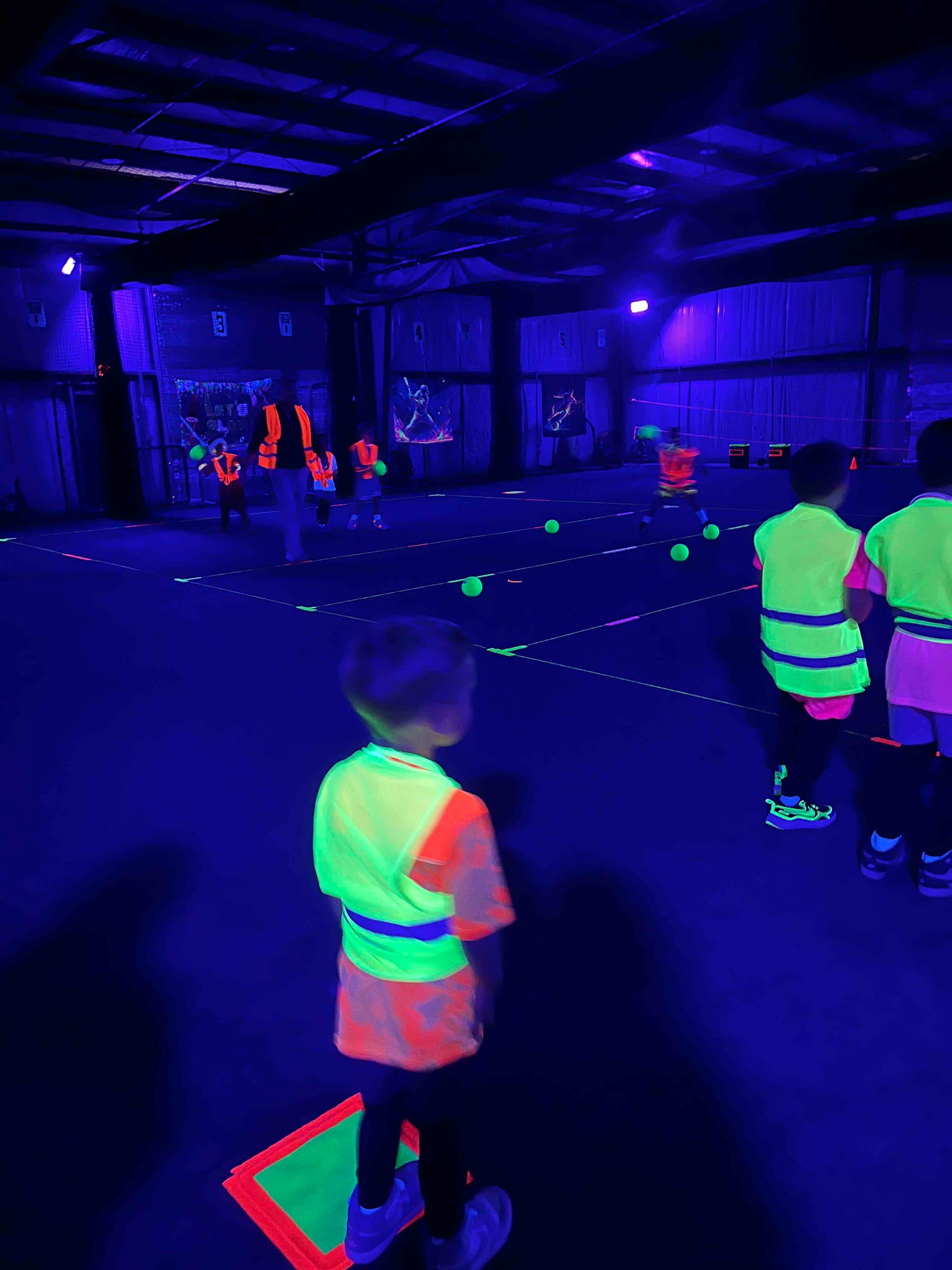 Their glow-in-the-dark party is a truly unique experience. Kids wear glowing vests, and all equipment including bats, balls, nets, turf lines, and field markers lights up under blacklight, transforming the entire space into a neon sports arena. Every party includes access to a private party room where families can bring in their own food and decorations.